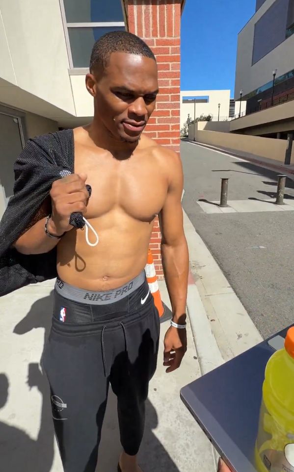 训练结束后,威少赤膊出镜,展示了一下自己的完美身材。