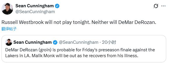 今日季前赛收官战,国王多名球员缺席与湖人的比赛,据国王随队记者Sean Cunningham报道,马利克-蒙克和德罗赞(腹股沟)都因伤缺席比赛,国王新援威少也不会出战。